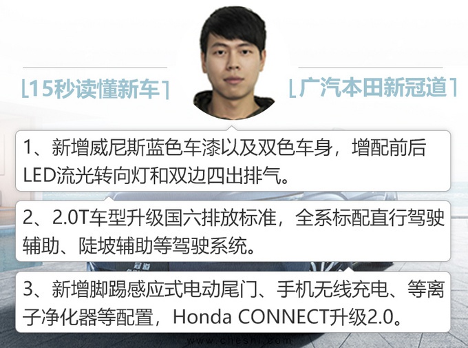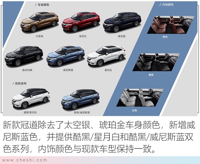 网上车市从广汽本田官方获悉,广汽本田新款冠道 (配置|询价)正式上市,共推出8款配置车型,较老款有所精简,官方指导价为22.00-33.28万元。新车在外观细节方面做出调整,并新增威尼斯蓝色和双色车漆。2.0T车型升级国六排放标准,并新增直行驾驶辅助、前后LED流水转向灯以及脚踢式电动尾门等配置。新冠道定位中型SUV,将继续主打“大五座”市场,与丰田汉兰达 (配置|询价)、大众途观 (配置|询价)L、别克昂科威等车型展开竞争。
