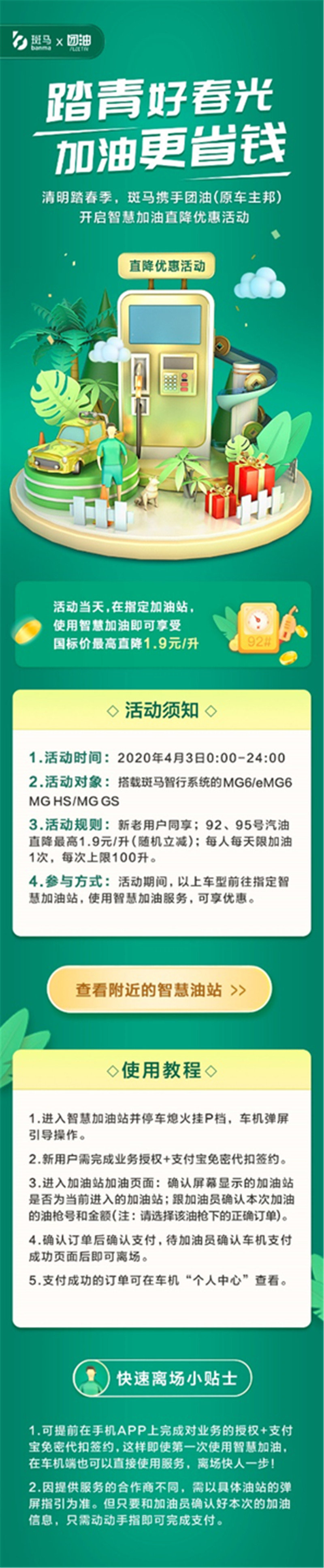 上汽首创“智慧加油”送福利,名爵6 (配置|询价)、名爵HS等车型车主速来领取!4月3日,斑马公司携手车主邦开启“踏青好春光,加油更省钱”的智慧加油直降优惠活动,为用户送出暖心福利。本次活动,凡搭载斑马智行系统的名爵HS、名爵6等车型车主均可无门槛参加,一键开启智慧加油模式,就能享受92、95号汽油直降最高1.9元/升的优惠(随机立减)。具体能省多少?以名爵HS为例,加满容积为55L的油箱,一次最高能省上百元,非常划算。注意,活动仅限4月3日当天,每人限加油1次,上限100升,加的越多,省的越多,还在等什么,快来接收这波省钱攻略。