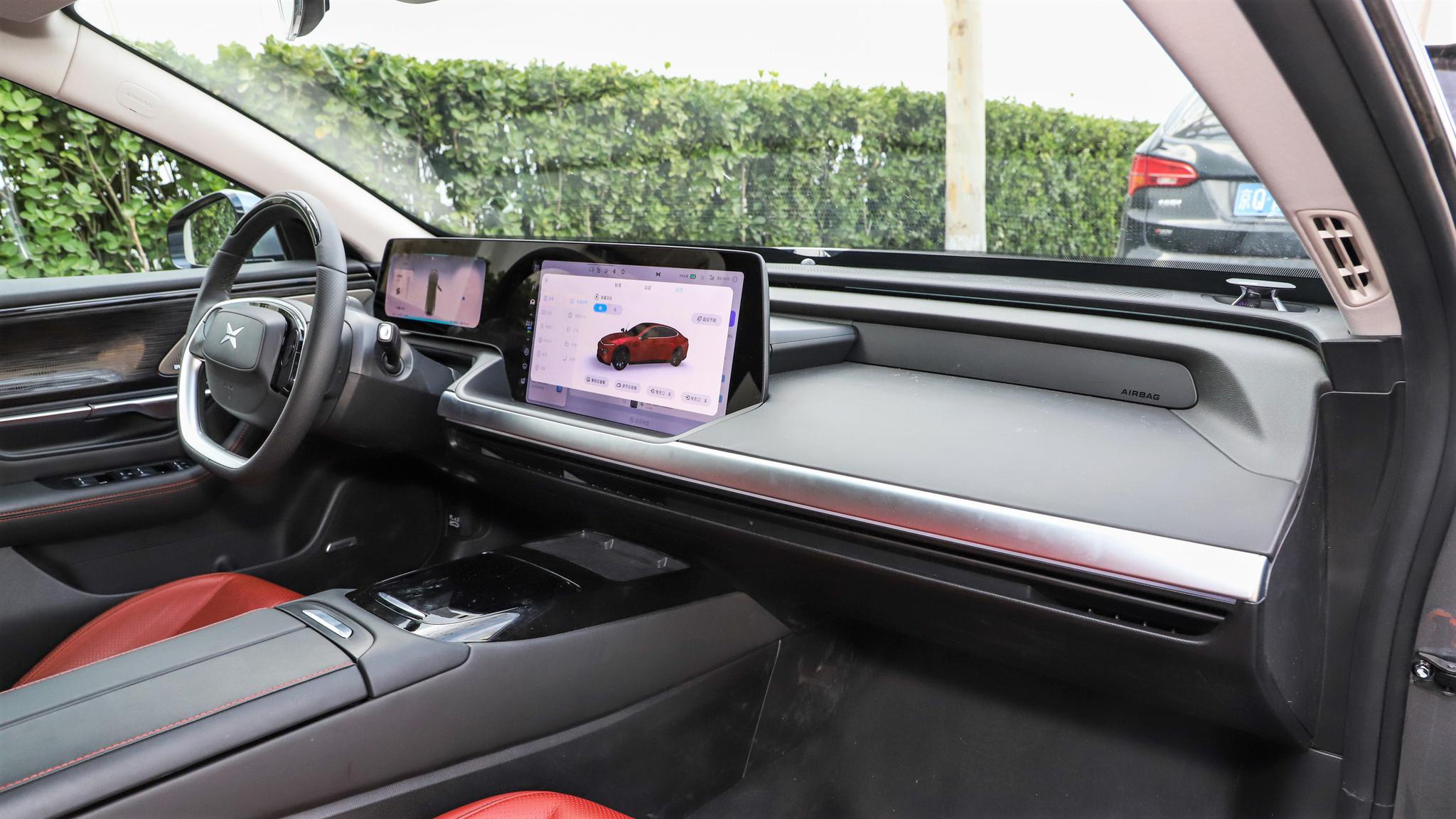 内饰方面,小鹏P7使用了目前最为流行的贯穿式大屏设计,简约的中控线条凸显了电动车的风格,双幅式方向盘造型也比较具有未来感。