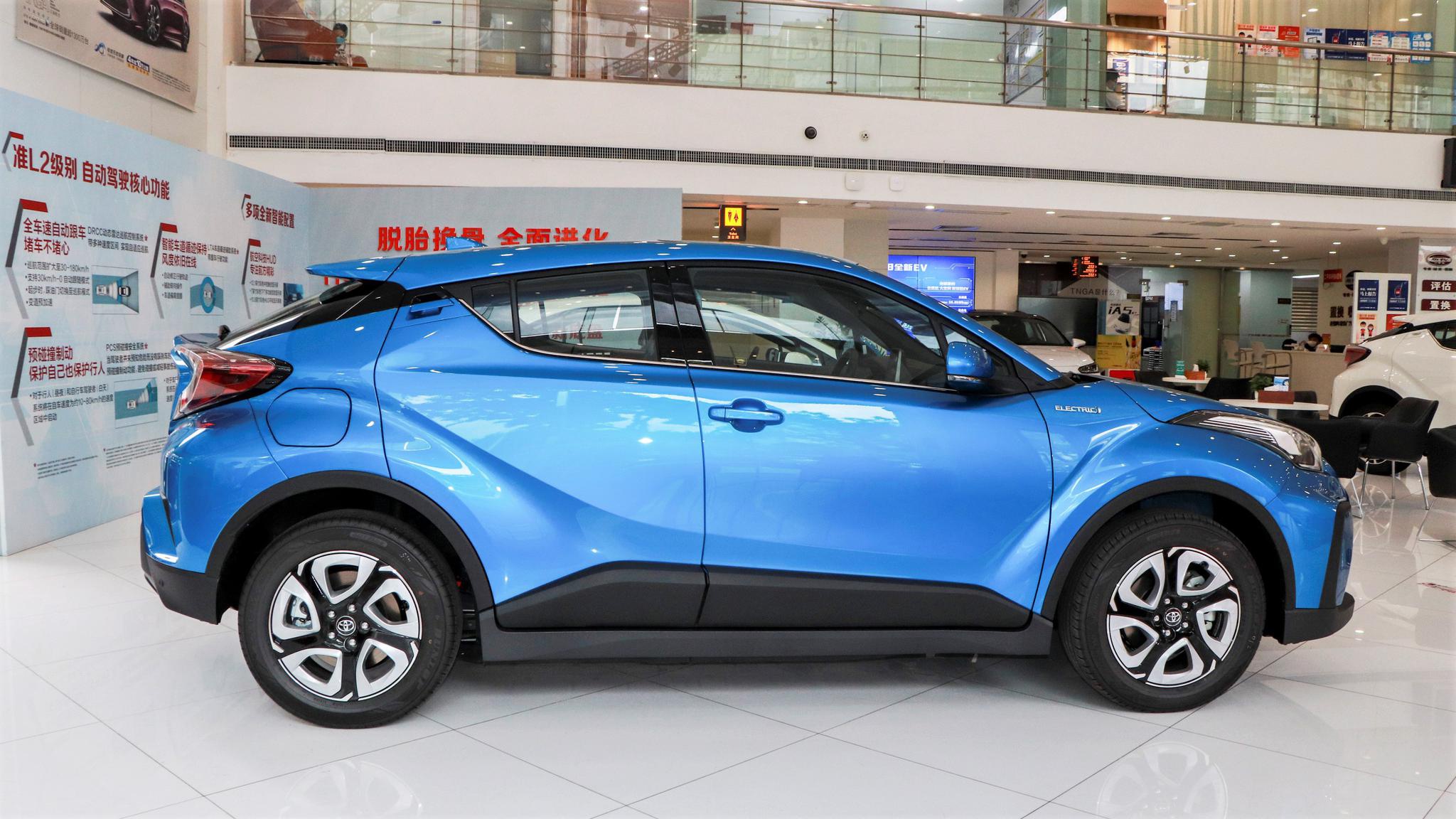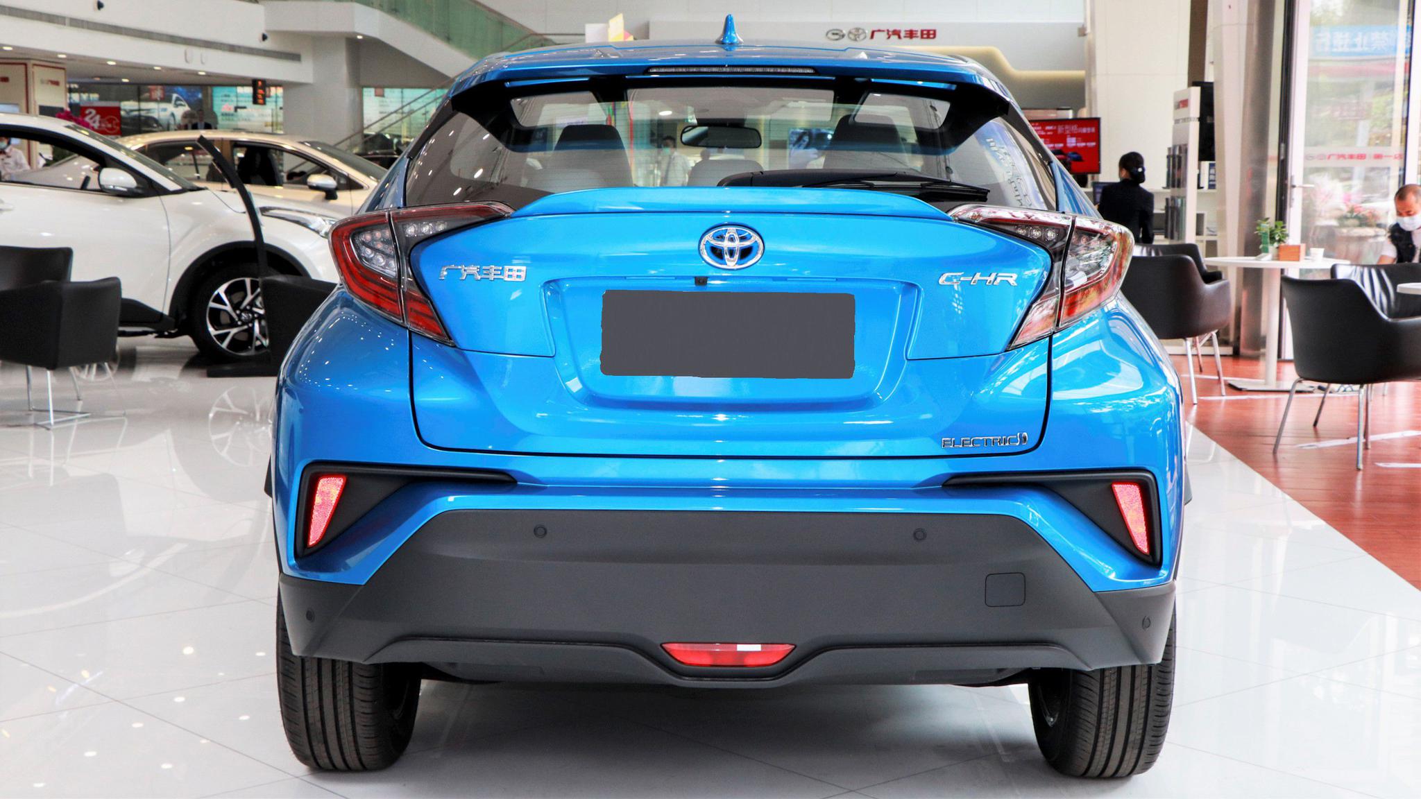 侧面依旧是C-HR标志性的线条造型,大幅上扬的窗线配合溜背车顶,营造出一个轿跑车的视觉感受,隐藏式的后门把手更加重了这种视觉效果,这也导致它的后排视野比较压抑。轮圈的造型也与汽油版有一定区别,更符合电动车的风格。
