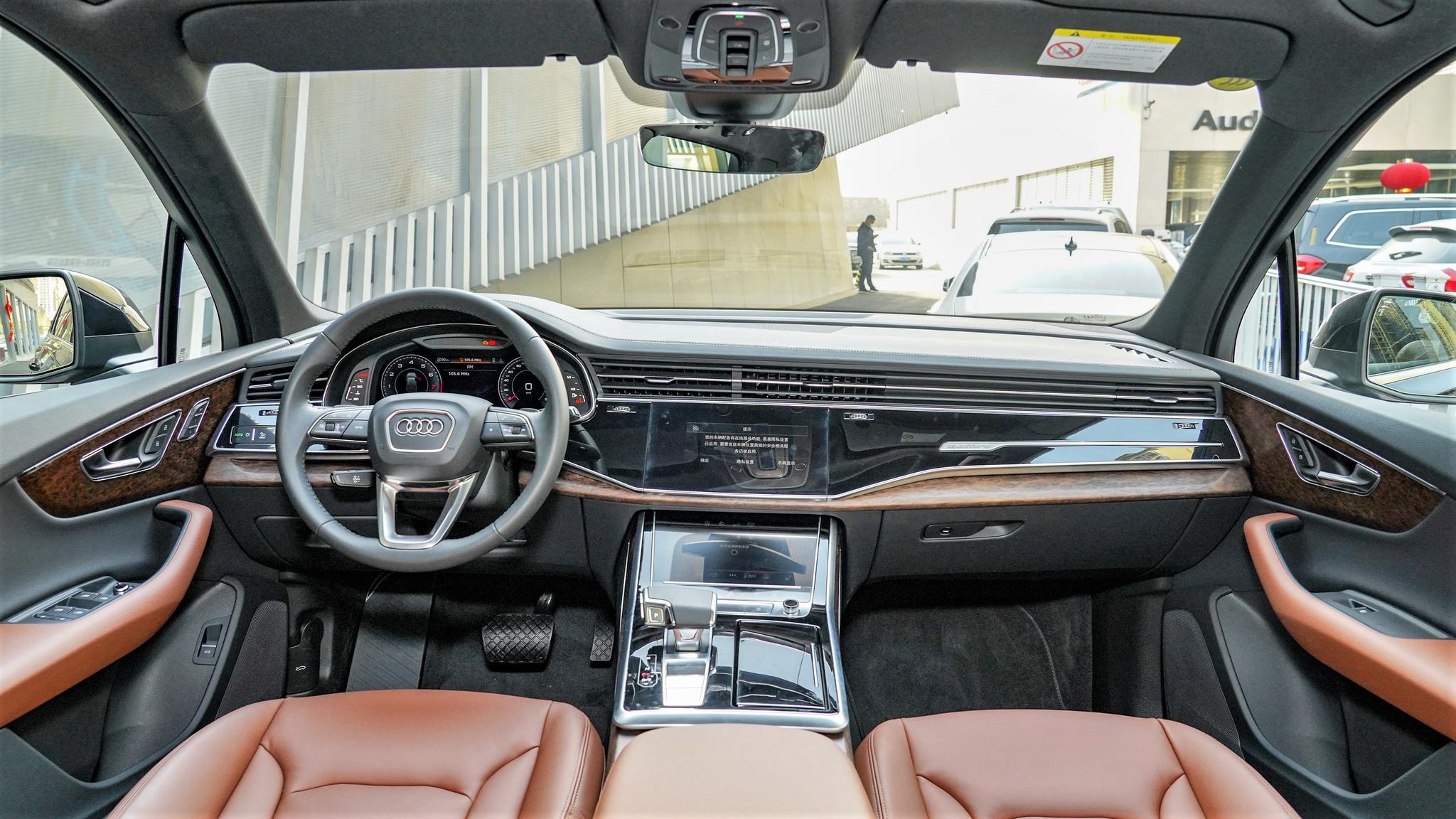 内饰方面,新款Q7也换用了与Q8、A6相同的设计,三块液晶屏组成奥迪虚拟座舱,平直的线条很符合奥迪一贯的机械感。