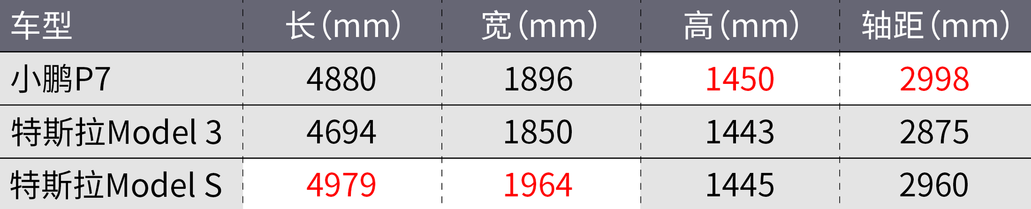 尺寸方面,小鹏P7的长宽高分别为4880/1896/1450mm,轴距为2998mm。P7的车长和宽度接近特斯拉Model S,轴距甚至比Model S更长一些,如果对比价格接近的Model 3则具备非常明显的尺寸优势了。