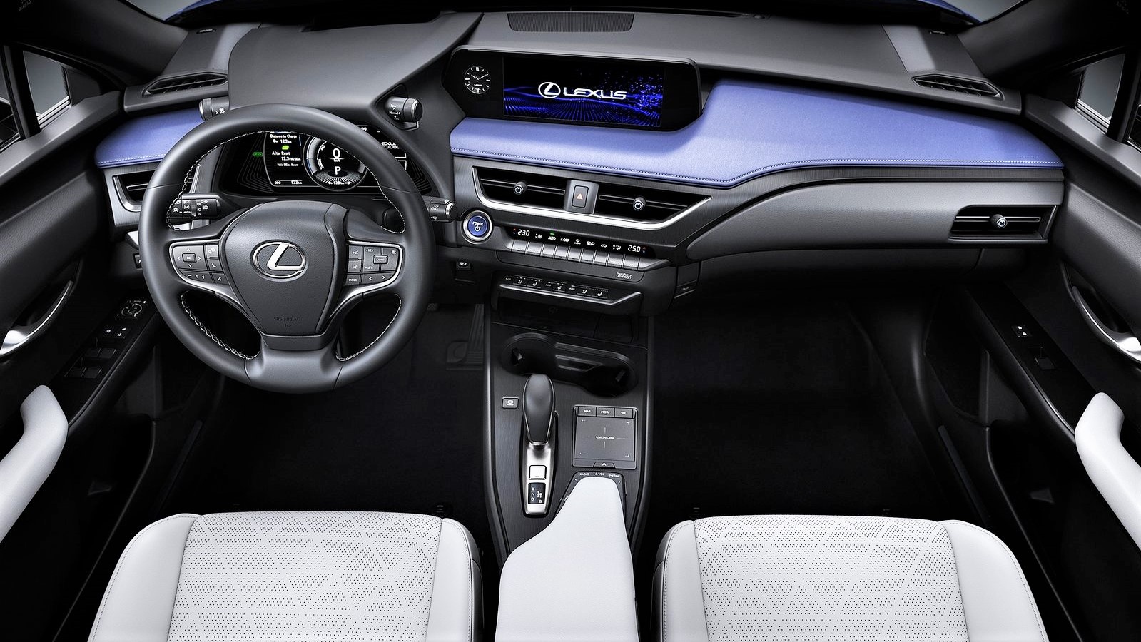 内饰延续了UX精致时尚的风格,蓝白真皮的搭配,还有细腻的缝线,中控台同样向驾驶员一侧倾斜。