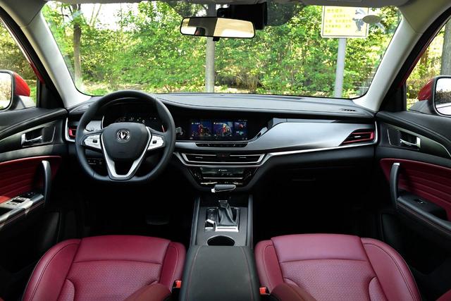 而内饰同样采用家族式环抱式设计,变化不大,在长安睿骋CC、逸动 (配置|询价)等轿车内饰设计语言下有着SUV的特点,在位置更高的仪表台,中控大屏和仪表盘的布局上有所差异。并提供黑、红两种座椅颜色可选,看起来较有质感。