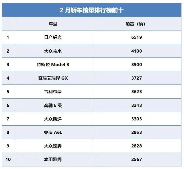 不得不说,2月轿车销量榜单真的亮点多多,精彩异常。表现坚挺的轩逸,迅速攀升至季军位置的特斯拉Model 3,国产双雄奇瑞艾瑞泽GX和吉利帝豪挤进前五,奔驰E级和奥迪A6L位列前十……以上车型用最硬的数据告诉消费者:这么多车型中,为什么它们才最值得一买!