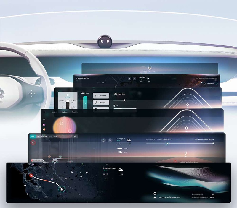 与这套内饰相匹配的是新车机系统,其YUI界面更加扁平化,同时也要简洁。从效果图上看,其将会有多个主题,整体有着极强的极客风格。