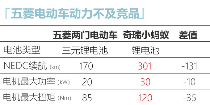 从车型定位来看,五菱全新两门电动车最大竞争对手为奇瑞小蚂蚁,奇瑞小蚂蚁提供2座和4座版本,可选择性更多。奇瑞小蚂蚁最高车速100km/h,NEDC综合续航里程为301km,0-50km/h加速时间为6秒。