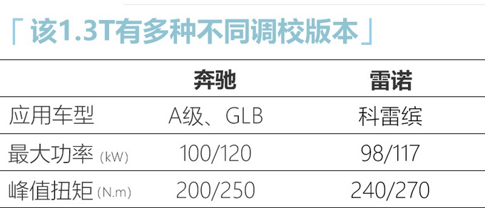 这台代号为HR13DDT的发动机并不是全新机型,最早在2017年底就已经发布,它拥有缸内直喷、涡轮增压,以及双可变气门正时等技术加持。目前国内部分奔驰和雷诺车型都已经搭载该发动机,由于品牌以及车型不同,这款1.3T也有不同的调校数据。例如A级就分为A 180L和A 200L两个版本,最大功率分别为100kW、120kW,雷诺科雷缤采用后最大功率又变为117kW。