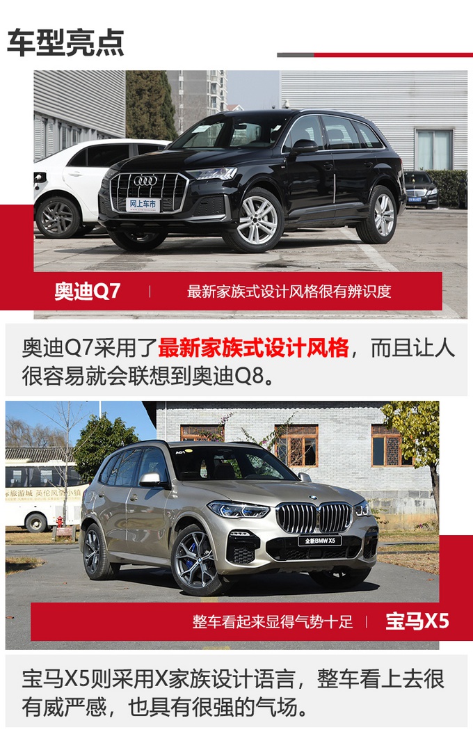 针锋相对的价格,让人们很直观的就可以看出,作为奥迪Q7入门版的2020款 45 TFSI quattro 致享专享版和宝马X5入门版的2020款 xDrive30i X设计套装将形成最为直接的竞争。并且经过我们仔细查看网上车市后台数据和询问经销商后了解到,现款奥迪Q7主销车型为45 TFSI quattro配置版本车型,根据预测未来新款奥迪Q7将同样如此。宝马X5主销车型为xDrive30i配置版本车型。也就是说,两者的2.0T版本车型同为主销款车型。所以,我们选取的正是官方指导价格为69.98万元的2020款奥迪Q7 45 TFSI quattro 致享专享版(下文简称:奥迪Q7)与官方指导价格为69.99万元的2020款 宝马X5 xDrive30i X设计套装(下文简称:宝马X5)进行综合对比。看看在具体的产品力上,谁更具有优势?(此外,还有一点需再做声明,本文所有关于宝马X5的车型配图均为2020款 xDrive40i M运动套装,非2020款 xDrive30i X设计套装。)