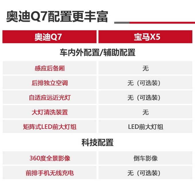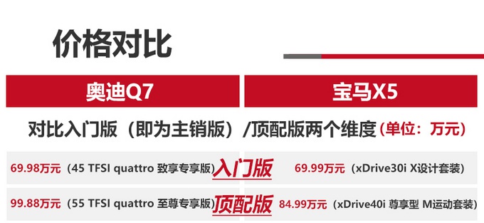 首先,有一点需要声明的是,新款奥迪Q7将于4月底正式上市。不过此前,新款奥迪Q7部分配置车型已完成上市,推出3款车型,官方售价区间为69.98-99.88万元,其余配置版本车型将于4月底推出。宝马X5全系共推出4款车型,官方售价区间69.99-84.99万元。由此可见,从目前的情况来看,奥迪Q7与宝马X5两者入门版车型的价格仅存在0.01万元的差价,而顶配版车型的价格还是奥迪Q7要明显高于宝马X5。