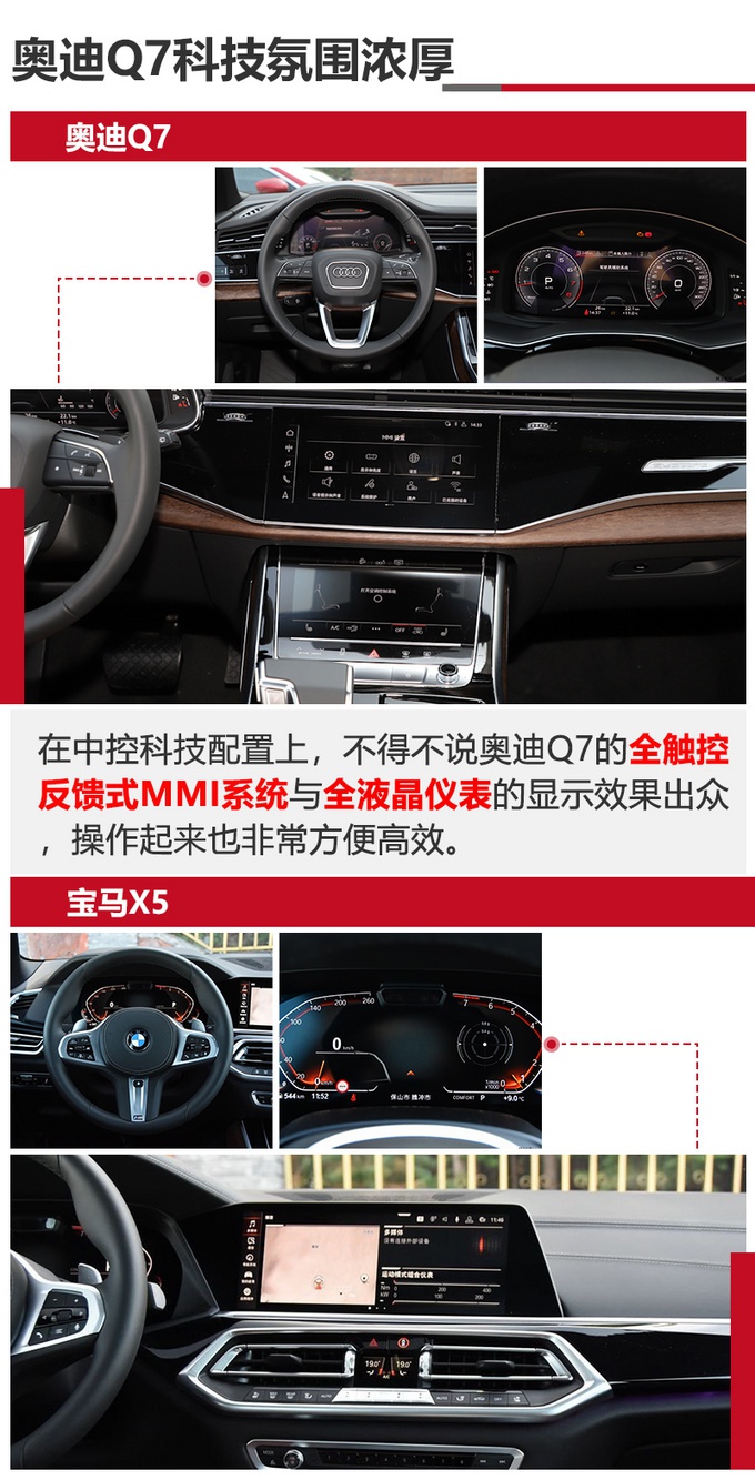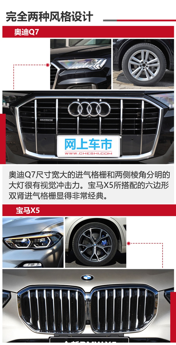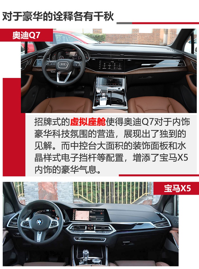 可以看到,两款车在外观设计上是两者完全不同的风格。在圆润饱满的车身造型设计中,奥迪Q7融入了大尺寸前进气格栅、尾部贯穿式镀铬饰条和造型偏平的LED尾灯组等元素,提升了车辆的个性与时尚之感,以迎合更多消费者的胃口。而作为宝马品牌车型的一种标识,六边形双肾进气格栅首先让宝马X5很有辨识度,同时有些方正的车身造型,也令车辆显得富有气势。至于说,两款车型究竟谁看上去更出色?没有人能给出绝对的答案,还是要看个人审美的目光。