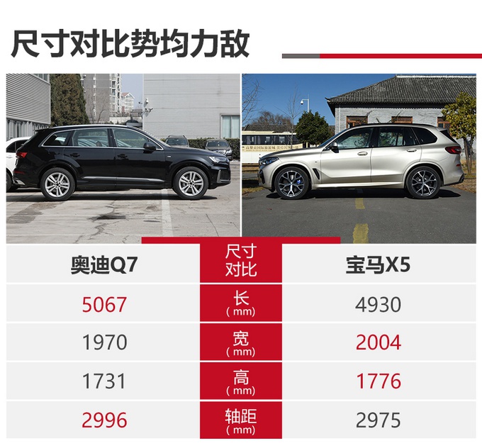同为中大型豪华SUV,两者在车身尺寸上不会有太大的差距。其中奥迪Q7在车身长度和轴距上略占上风,这样也将会为车内乘客带来相对更宽裕些的驾乘空间。而相对落后的宽度和高度数据,体现在的则是视觉上的差异,奥迪Q7的造型比较饱满,宝马X5则很有肌肉感。
