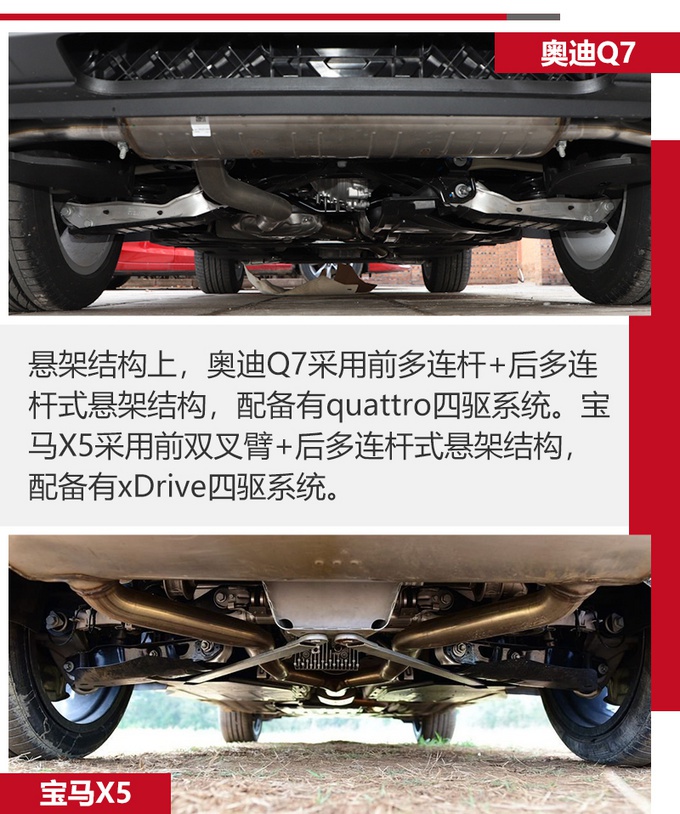 动力方面,两款车均采用2.0T+8速手自一体的动力总成,只是账面参数略有差异。其中宝马X5虽说有小幅的领先,不过在0-100km/h加速时间上,奥迪Q7和宝马X5的时间分别为7.1s和6.9s,处于势均力敌的水准。此外,奥迪Q7的231km/h最高车速要比宝马X5的225km/h最高车速听起来更刺激,但是这听听就好,万万不要尝试。