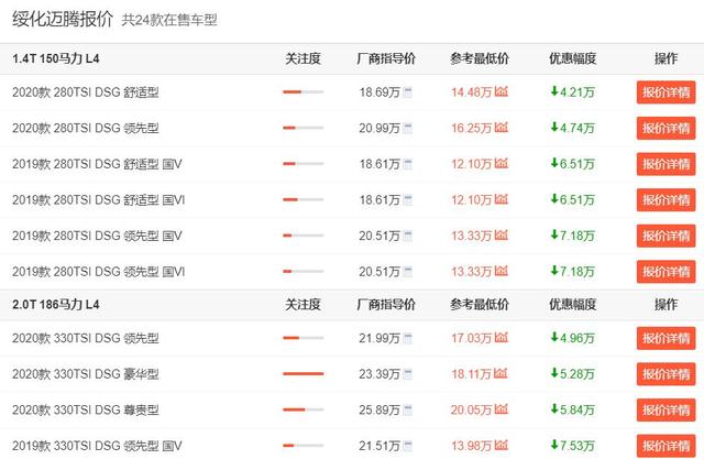 从全国各地的情况来看,迈腾的综合优惠大概在4.6万-6万元之间,也就是说即便咱们买不到全国价格最低地区的迈腾,现在去买这款车也是能有不小优惠的。相比于凯美瑞和雅阁,显然迈腾的性价比会更高,所以这难道还不值得去入手吗?