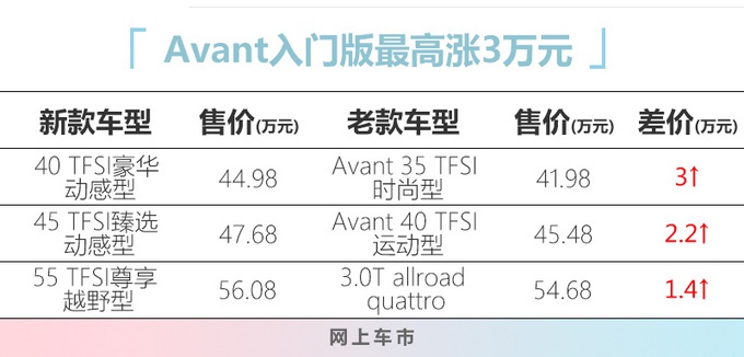 4月2日,奥迪全新A6 Avant 先锋派和A6 Allroad (配置|询价) 探索家正式上市,共推出3款车型,官方售价区间为44.98-56.08万元,其中Avant 40豪华动感型相比老款上调3万元,同时配置也进行相应提升。两款新车基于奥迪MLB Evo平台打造,外观、内饰设计更加年轻化,尺寸和动力也比老款车型更有优势。