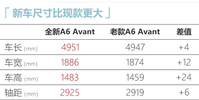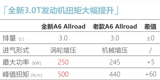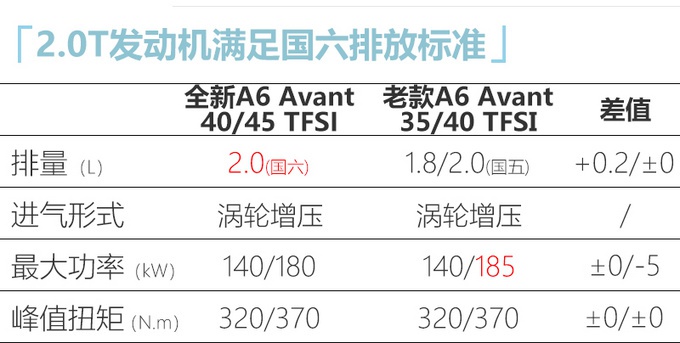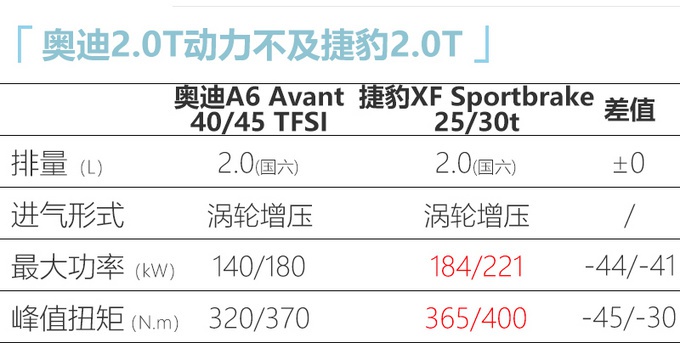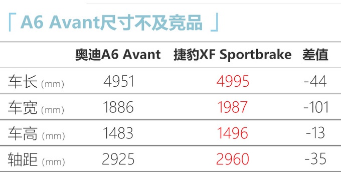 全新A6旅行版家族2款车型整体尺寸全面提升,Avant车型比同级竞品捷豹XF略小,Allroad车型与沃尔沃V90 (配置|询价) CrossCountry互有优势。动力方面,全新A6 Avant搭载2.0T(高/低功率)发动机,动力表现不及捷豹XF,传动系统新车匹配7速双离合变速箱。全新A6 Allroad换搭的3.0T发动机还配备48V轻混系统,传动系统匹配7速双离合变速箱,配备quattro四驱系统以及空气悬架。