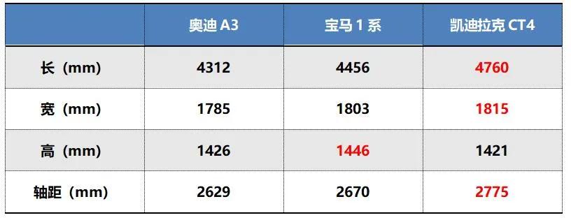 国产版凯迪拉克CT4定位于入门中型车,长宽高分别为4760/1815/1421mm,轴距为2775mm。而奥迪A3、宝马1系却是定位紧凑型车,从车身尺寸上就小了一圈。差不多的价格,能买大一点的车何乐而不为呢?相信凯迪拉克就是抓住了中国消费者这样的心思。