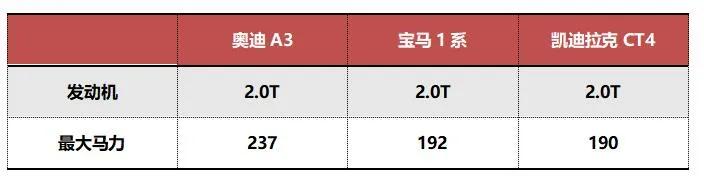 而奥迪A3、宝马1系搭载的2.0T发动机,其性能表现则不如凯迪拉克CT4。从表格可以看到,宝马1系配备的2.0T发动机,其最大功率192马力;奥迪A3配备的2.0T发动机,最大功率190马力。两车都匹配的是7挡双离合变速箱。