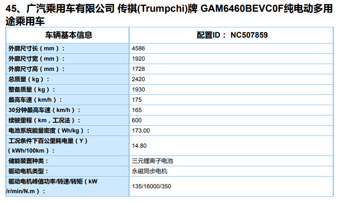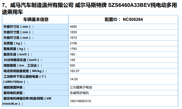 在这批新能源车型目录中,轱辘哥也发现了威马汽车的两款新车型。从尺寸来看,它们有可能是新款的威马EX5和威马EX6Plus。其中,威马EX5的尺寸保持不变,NEDC续航里程也为520km。威马EX6Plus的NEDC续航里程则为503km。另外,新车驱动电机的最大功率也是160kW,最大扭矩315N·m。