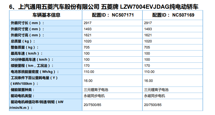 从公布的参数来看,五菱宏光MINI EV长宽高仅为2917/1493/1621mm,轴距为1940mm。动力部分,新车搭载最大功率为20kW的电动机,NEDC工况下续航里程为17km。