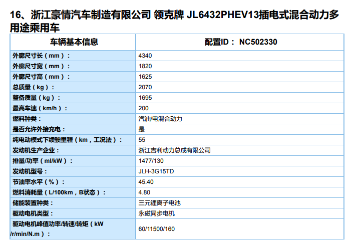 据目录消息可以看到,领克06 PHEV将搭载一台1.5T+电动机的动力总成,其中1.5T发动机最大输出功率130kW,匹配DCT变速箱。整车的经济性表现也很出色,节油率水平达到45.4%,纯电动模式下的续航里程达55km。