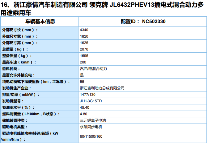 从申报信息来看,领克06 (配置|询价) PHEV将配备1.5T三缸发动机和电机组成的动力系统,其中发动机最大功率为177马力(130千瓦),峰值扭矩为265牛·米,而电机最大功率为60千瓦(82马力),峰值扭矩160牛·米。其将配备三元锂电池组,纯电续航为55km。