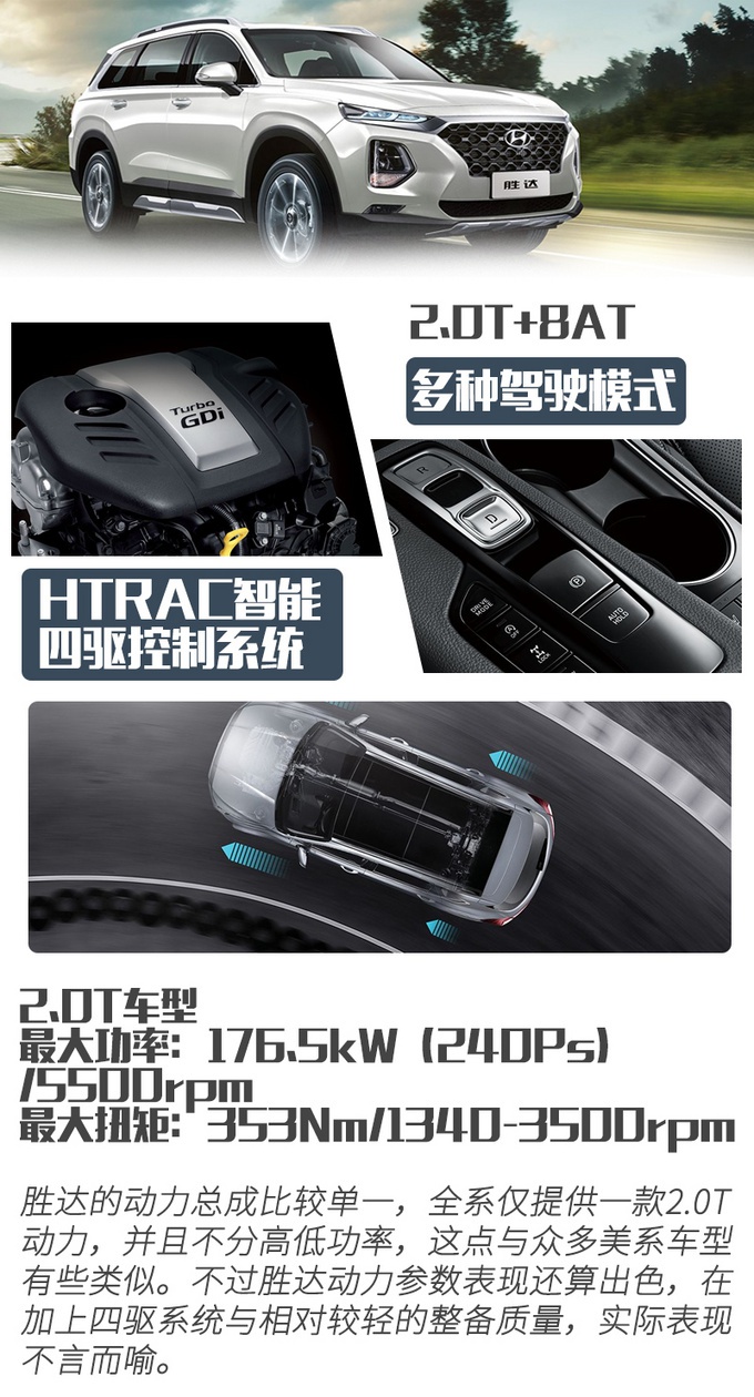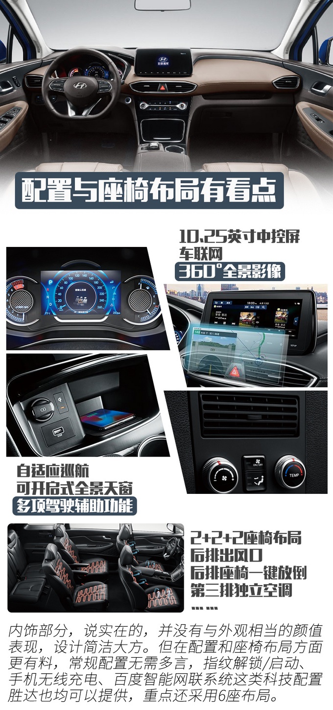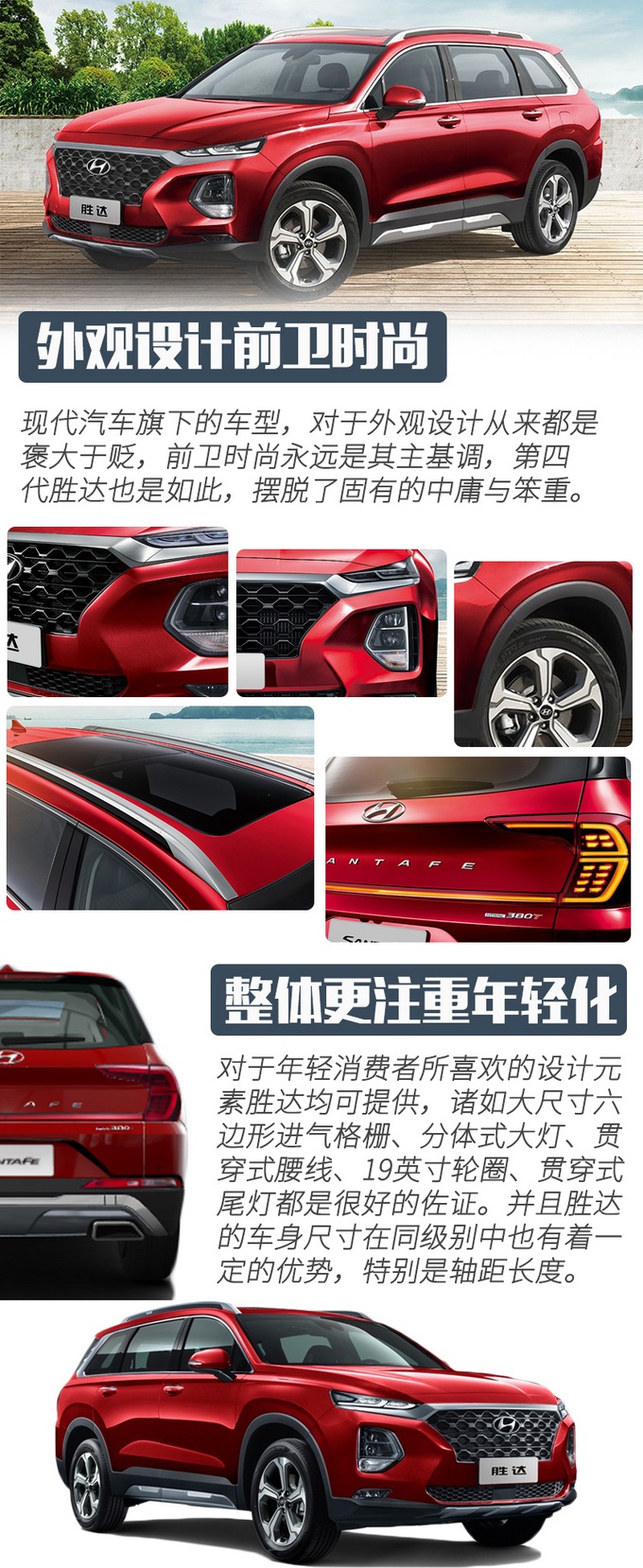 推荐理由:第四代胜达全系共推出8款车型,售价区间为20.28-27.28万元。通过售价与定位可以看出直接竞争汉兰达车型,不过其售价方面更有优势,并且北京地区现阶段还有着1.2万元左右的优惠力度。而胜达车型自身的优势在于,首先是2+2+2的6座布局,第三排乘客上下车也尤为方便,并且不需要像7座车那样一年一检。其次是眼见之处的外观设计,这也是现代汽车的拿手好戏,设计师通过前卫的元素使其整体更显年轻时尚。而在配置方面,也是韩系车的强项,在基础配置的基础上,胜达还配备了指纹解锁/启动、百度智能网联系统等配置,让用车体验科技感十足。最后就是动力部分,全系均搭载2.0T+8AT动力总成,也是现阶段中型SUV最为主流的配置。所以说,预算有限且对于空间和配置有着更高要求的消费者可以选择第四代胜达。