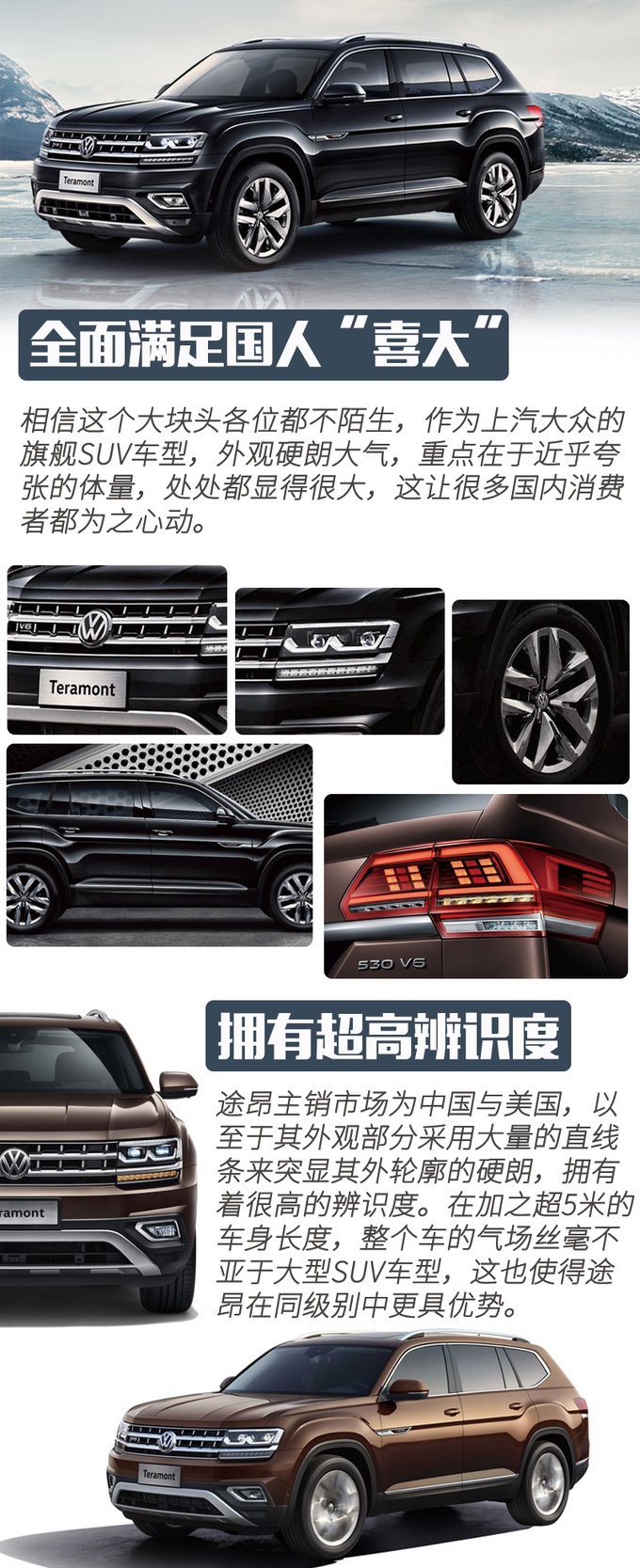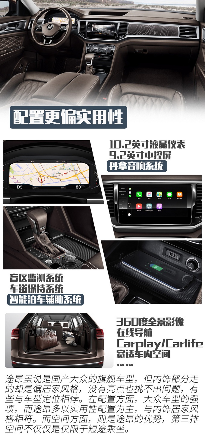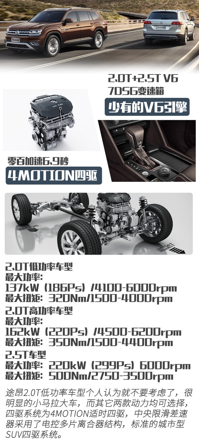 推荐理由:途昂是上汽大众的旗舰SUV,也是大众在国内的旗舰SUV,全系共8款车型,售价区间为30.09-50.59万元。通过售价可以得知,它是本文最贵一款车,不过前不久官方进行了调价,最新的指导价格区间为29.99-45.99万元。不仅如此,现阶段终端优惠力度更是可观,北京地区有着4.5万元左右的优惠,如此一来,途昂的售价也并不算高。回到车型自身,途昂最大的优势莫过于车身尺寸与品牌力,如此大的大众SUV又有着如此高的优惠,很难不让国内消费者心动。配置方面更是如此,标准的满配家用车。至于动力部分,2.0T低功率车型各位也应该知道它存在的意义,若选择途昂的话,2.0T高功率和2.5T车型才是正确的选择。