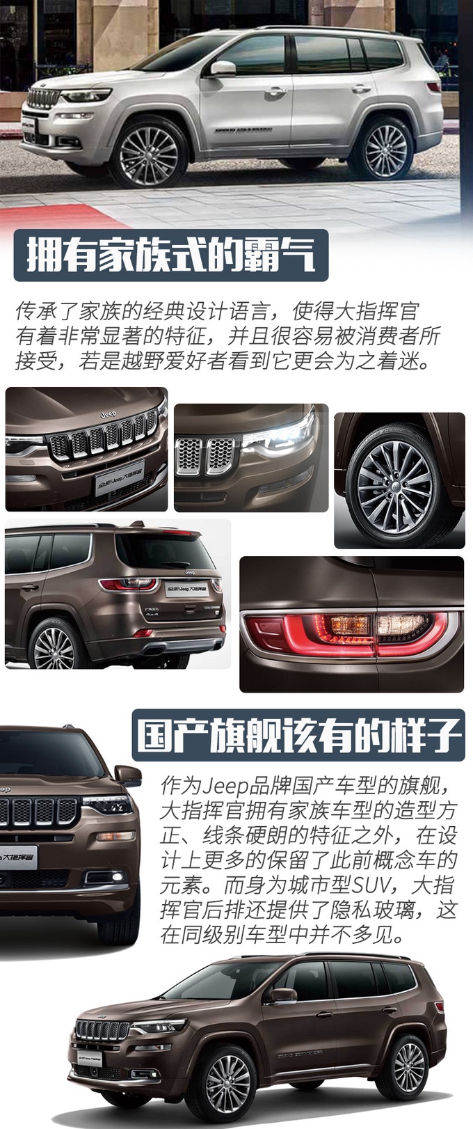 推荐理由:大指挥官作为Jeep品牌在国内的旗舰车型,全系提供两种动力共计8款车型,售价区间为27.98-40.98万元,现阶段北京地区有着0.8万元左右的优惠幅度。至于大指挥官的产品优势,很显而易见,这款越野世家的车型,在越野方面自然有着绝对优势,并且动力方面也有不小的优势,2.0T高功率车型最大扭矩可达400Nm,可以说很美系。而在设计方面,家族最经典的元素均有体现,且还拥有一定的时尚感。而在配置方面,大指挥官也有着不俗的表现,可全面满足家庭用车的需求。大指挥官的特性非常明显,标准的美式SUV,不错的越野能力,强劲的动力,都是它的标签。