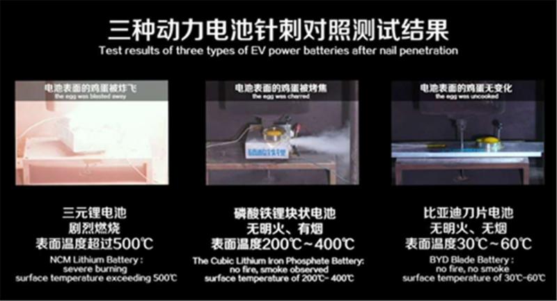 在同样的测试条件下,三元锂电池在针刺瞬间出现剧烈的温度变化,表面温度迅速超过500℃,并发生极端热失控,开始剧烈燃烧,电池表面的鸡蛋被炸飞;传统磷酸铁锂电池在被穿透后无明火,有烟雾从电池卸压阀喷出,表面温度达到了200℃-400℃,电池表面的鸡蛋被高温烤焦;比亚迪刀片电池在穿透后无明火,甚至无烟雾,电池表面的鸡蛋无变化。表现最为抢眼的是刀片电池在被刺穿的时候,并没有任何的异常表现,甚至连冒烟都没有,结构依旧稳定,通过温度传感器显示,电池表面的温度只有30℃左右,甚至低于夏季北京地面最高70℃的温度。