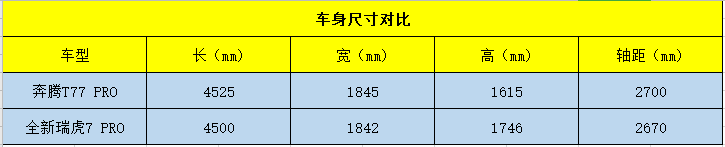 车身尺寸上,奔腾T77PRO的长宽高分别为4525/1845/1615mm,轴距为2700mm;瑞虎7PRO的长宽高分别为4500/1842/1746mm,轴距为2670mm。