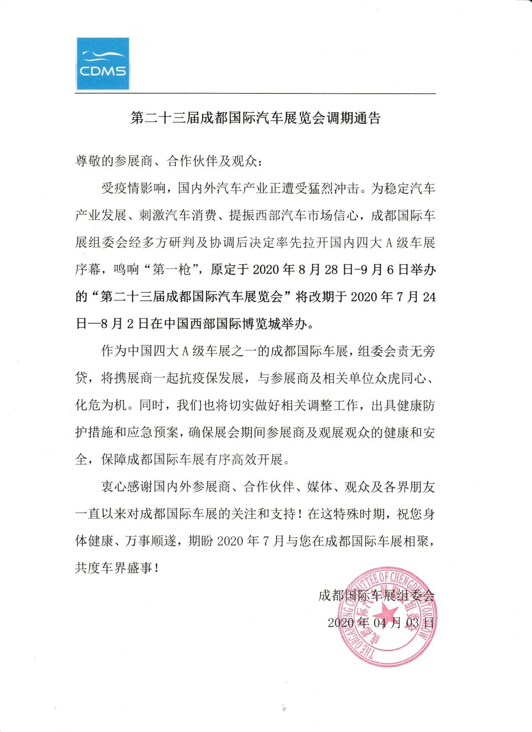 为稳定汽车产业发展、刺激汽车消费、提振西部汽车市场信心,成都国际车展组委会经多方研判及协调后决定率先拉开国内四大A级车展序幕,鸣响“第一枪”,原定于2020年8月28日-9月6日举办的“第二十三届成都国际汽车展览会”将改期于2020年7月24日—8月2日在中国西部国际博览城举办。