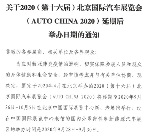 4月3日,中国国际贸易促进委员会汽车行业分会官方发布,原定于2020年4月在北京举办的2020(第十六届)北京国际汽车展览会(AUTOCHINA2020)将延期至2020年9月26日-10月5日在北京中国国际展览中心新、老展馆举行,设在中国国际展览中心老馆的国内外零部件和新能源汽车展区的举办时间是2020年9月28日-9月30日。