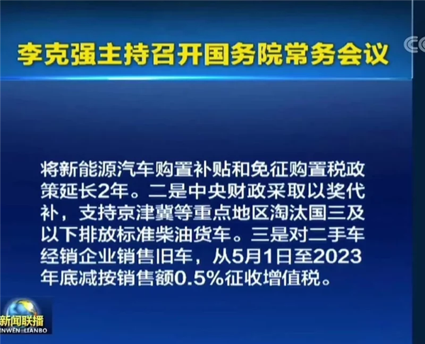 3月31日召开的国务院常务会议上,国务院总理李克强明确指出,为促进汽车消费,会议确定,一是将新能源汽车购置补贴和免征购置税政策延长2年。