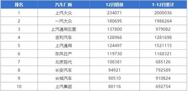 2019年的汽车销量榜单,虽然变数颇多,但最终结果和此前相仿。100万台以上年销体量的车企,在2019年的中国汽车市场里只残存有上汽大众、一汽大众、吉利汽车、上汽通用、东风日产,如果是100万台左右的成绩单,能够新增入围的名额也只有上汽通用五菱、长城汽车两家。