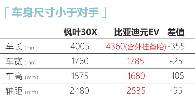 从枫叶30X的市场定位来看,其上市后面临的主要挑战便是比亚迪元EV。后者是当前中国新能源汽车市场中销量最好的纯电动小型SUV,不含补贴的官方售价为12.38万-16.49万元,枫叶30X的价格预计较之略低一些。(部分图片来源于网络)