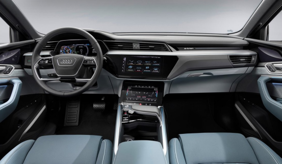 内饰方面,奥迪E-tron Sportback与奥迪E-tron一样,最大的亮点还是双触屏MMI操作系统,其中上方8.6英寸触屏用于输入文本、操作便捷功能和自动空调,而下部12.1英寸触屏用来控制信息娱乐、电话、导航和专用E-tron设置。同时,新车还标配了1,920×720像素高分辨率12.3英寸仪表盘。前排座椅可以选择标准座椅、运动座椅、S-line运动座椅和定制轮廓座椅,提供通风和按摩功能并搭配鲜橙色对比色缝线和滚边。此外,还可以选装氛围灯和Bang&Olufsen Premium 3D音响系统。
