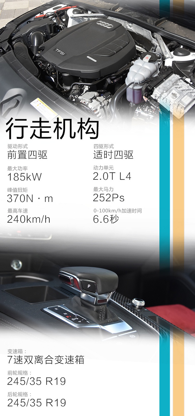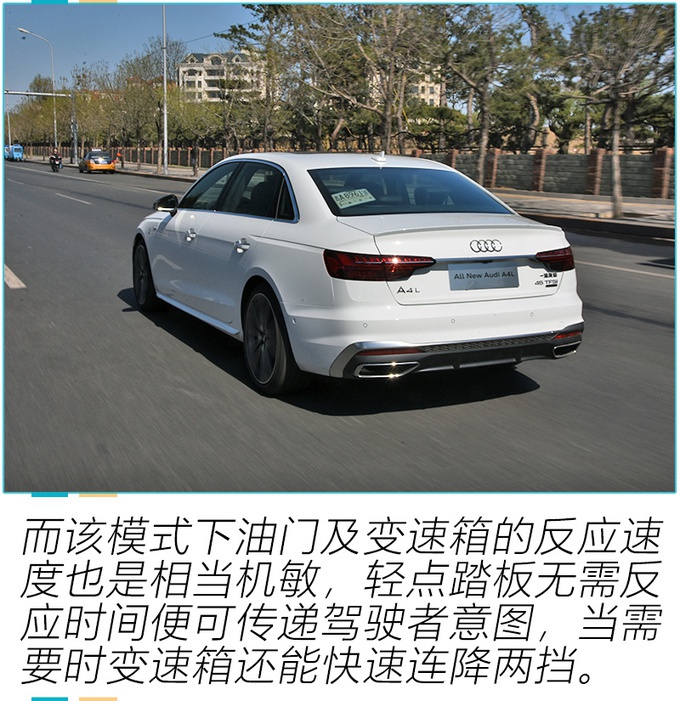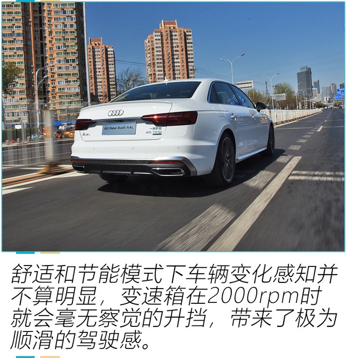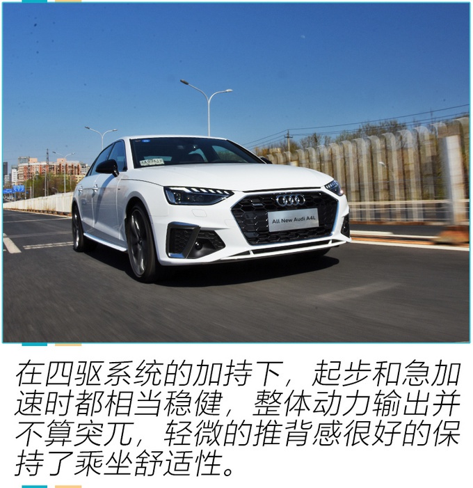开始体验前,我们先来看眼新款奥迪A4L车型的动力系统。新款A4L搭载三种不同功率调校版本的2.0T直列四缸涡轮增压发动机,而本次试驾的车型为45 TFSI高功率版本,发动机最大功率为185kW(252PS),峰值扭矩达370N·m,传动系统匹配一台S tronic 7速双离合变速箱,并装配quattro ultra智能四驱系统,百公里加速只需6.6秒。