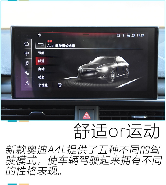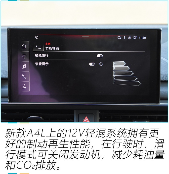 值得一提的是,为进一步提高舒适性和燃油经济性,新款奥迪A4L所有动力版本车型都配备了12V轻度混合动力系统。官方宣称,其储备能源可通过皮带式起动机降低发动机燃烧的负荷点,从而提升启停系统舒适性,减少涡轮迟滞,改进加速性能。