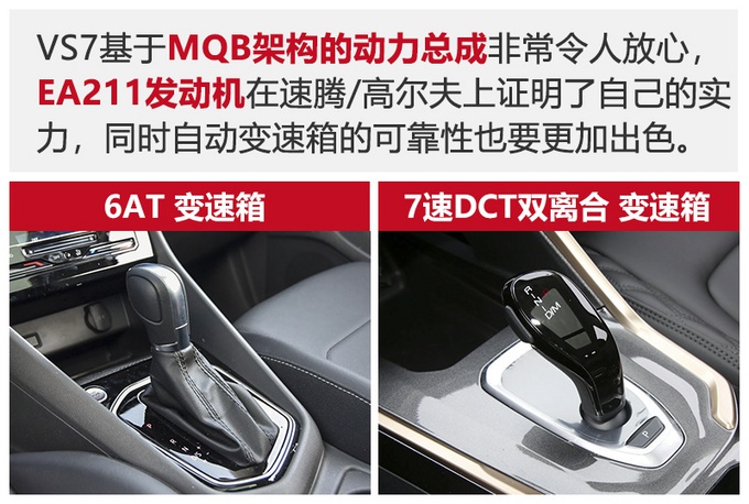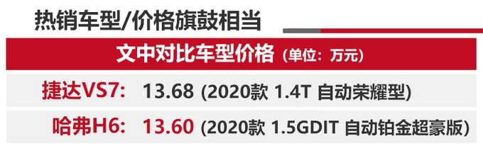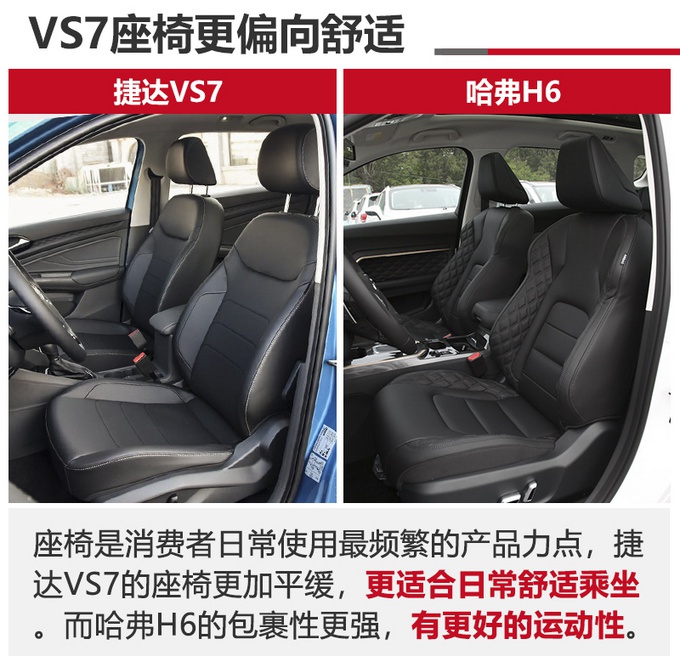 捷达VS7基于大众集团著名的MQB平台,经典的EA211发动机和靠谱的6速手自一体变速箱,科技性和经济性都很有保证。从工信部公布的综合油耗:6.7L/100km来看,在尺寸的SUV里是非常出色的。哈弗H6的动力参数非常惊人,即使是1.5T的发动机,124kW/285Nm的参数已经接近很多德系豪华品牌2.0T低功率的性能输出。加上7速DCT变速箱,整体的驾驶感受非常的爽快干脆。但对于此类SUV来说,动力输出并不是最重要的,平顺 踏实 省油 好开是更重要的。从这个标准出发我认为捷达VS7会是更好的那一个。
