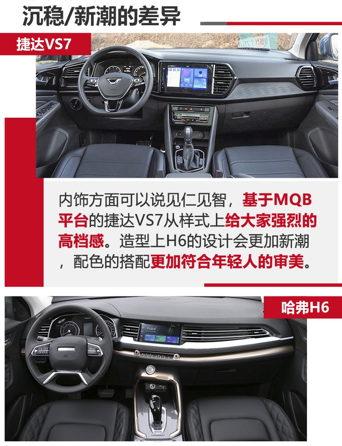 大众系的SUV有不少热销车型都深入人心,像奥迪Q7和途观L (配置|询价)这样的车型设计都非常有档次感,同样我们在捷达VS7上,也能看到同样的质感。首先基于MQB平台,它的设计就会带有大众SUV特有的基因,融入捷达品牌的元素,也让它充满了新意。而哈弗H6为了区分之前的“油腻”风格,开始积极向运动化转移。总而言之就是在设计上两者各有千秋,捷达VS7更有一定的高级感。