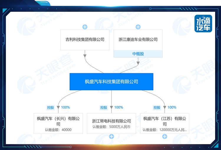 枫叶汽车的背景非常简单,从网上可查询到的资料来看,其公司主体为枫盛汽车科技集团有限公司。该公司由吉利科技集团有限公司和浙江康迪车业有限公司合资成立,注册资金24.04亿元,前者占78%,后者占22%。