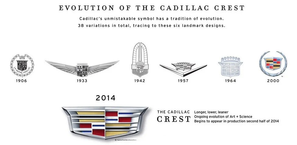 虽然作为创始人之一的利兰离开了凯迪拉克,但在随后的100多年时间中,凯迪拉克并没有因此停下脚步,设计出了无数流芳百世的经典车型。而凯迪拉克的Logo截止到今天,也进行了大大小小共计38次修改,直至2014年最后一次修改,王冠和花环全部消失,唯有这个象征着凯迪拉克家族的盾牌被保留了下来。