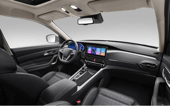 内饰方面,内饰配色以黑色和米色为主,使用大面积皮质柔软材质包裹,白色缝线进行点缀。采用三幅式平底方向盘,12.3英寸悬浮式液晶中控屏与全液晶仪表盘搭配造型精致的电子档把,增添科技气息。座椅的包裹性很强,乘坐感舒适。