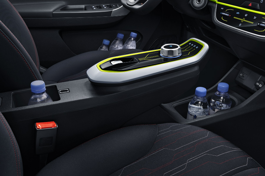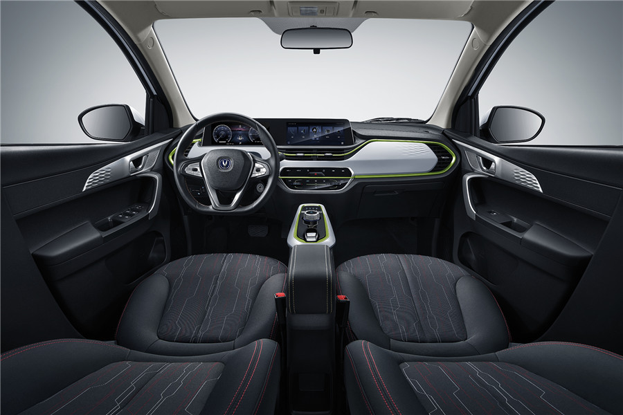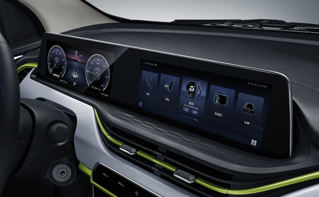 内饰采用荧光黄色点缀,最大亮点还是中控台上悬浮式的10.25英寸双联屏设计,新车挡杆为旋钮式造型,同时后方配有电子手刹。此外,这款车采用黑/白双色搭配,中控台、门板处均加入彰显新能源身份的绿色装饰条。