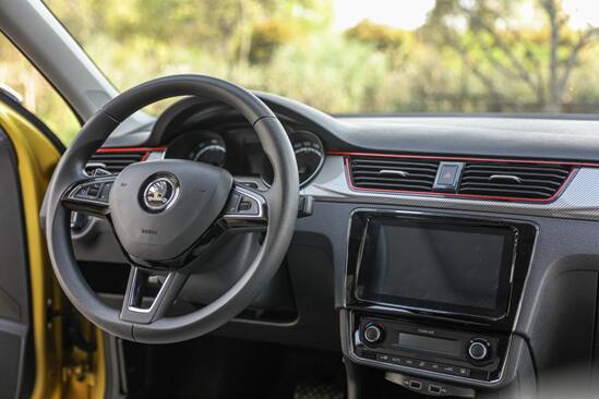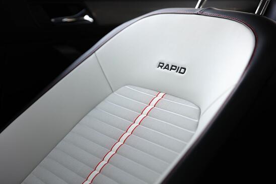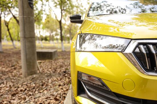 在车身侧面,一条贯穿式腰线从车头直达车尾,一气呵成,这种造型很容易烘托出硬朗的车身和运动的线条。五辐式双色拼接轮毂非常漂亮,中间的斯柯达车标也采用相同的色彩搭配,原厂轮毂如此漂亮,这一点确实值得点赞。