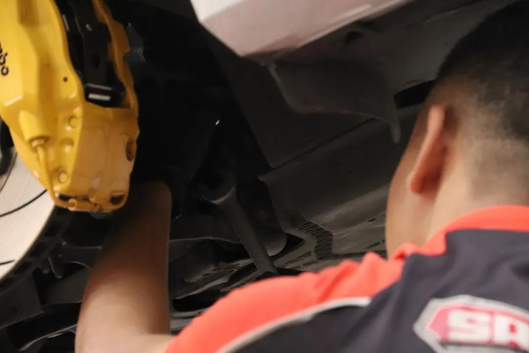 装车前,技师先检查过避震是否有质量问题,然后便开始卸轮毂和原避震,开始装车。靠谱的安装师傅会先做好车辆的防护措施,避免施工过程中损害车漆,细心程度值得点点赞。
