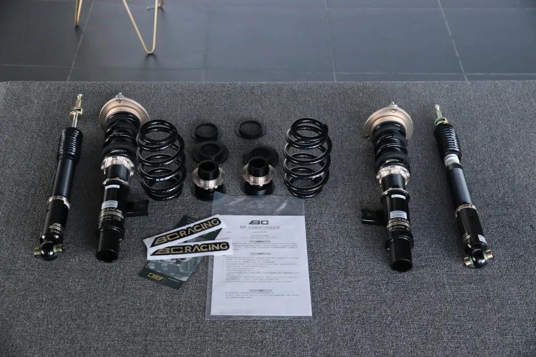 我这次装的是BC系列的BC BR系列,属于V1系列的加强版,兼顾日常街道和一定程度的激烈驾驶,全长高度可调,总共有30段阻尼可调。拆箱以后,箱内总共包含4条避震,两根防倾杆连杆,两个扳手,两张贴纸,还有说明书和正品保证书。