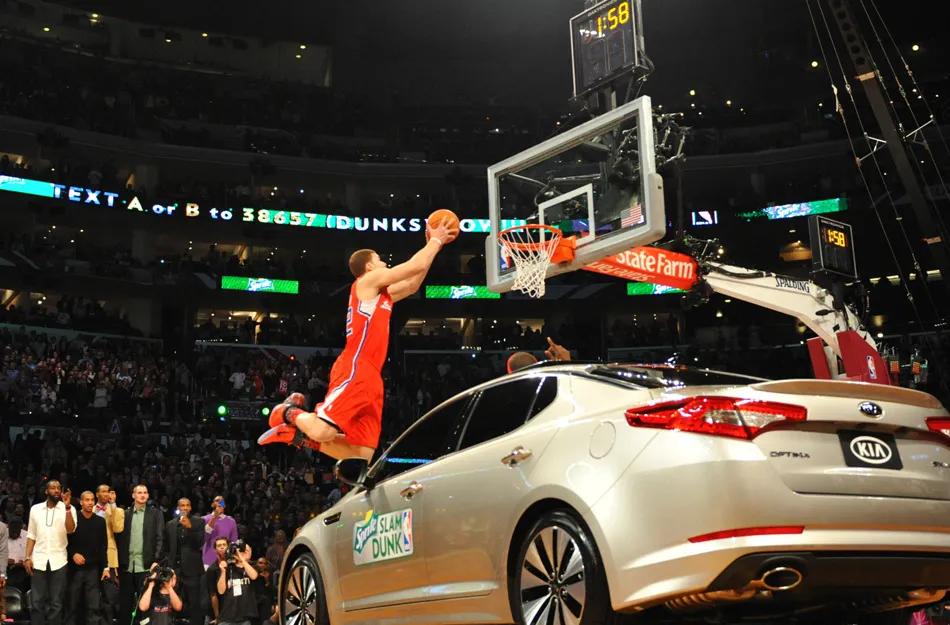 2011年NBA扣篮大赛,二年级新秀格里芬从一台起亚K5 (配置|询价)顶上飞跃而过,空中完成接球并成功扣篮,凭借着这一充满创意的扣篮表演,格里芬拿下当年NBA扣篮大赛冠军。