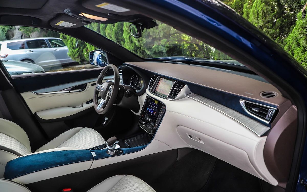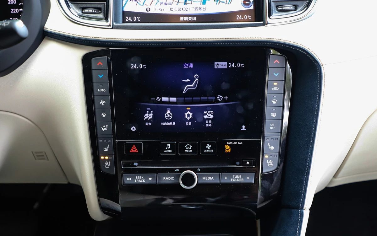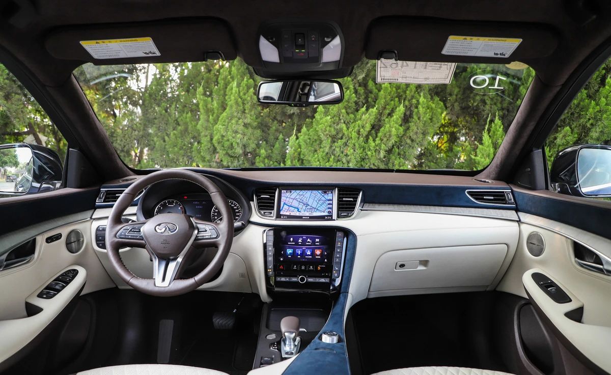 越活越“年轻”的QX50说到内饰,这也是最让我“感动”的一部分,原来传统刻板的内饰风格终于在这辆英菲尼迪QX50上消失了,在保留了英菲尼迪一贯简约的风格下,内饰设计进行了科技化、时尚化的升级,大面积的皮质包裹随处可见,中控屏幕分为了两块,上面负责导航显示、多媒体等功能,而下面的屏幕则担起了操作面板的“重任”,操作起来更加便捷顺手。在细节方面,这辆QX50处理的也是相当到位,小到旋钮按键、大到材质的细腻程度,这才是一个豪华品牌应该有的样子。